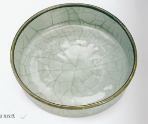 厘米,足徑12.3厘米。洗壁垂直微向外撇,平底,圈足寬而淺。通體灰青色釉,青翠如玉,釉汁肥厚凝重,釉面布滿了自然天成、縱橫交錯的開片。洗口部鑲銅口,圈足露胎呈褐色,紫口鐵足的特征十分明顯。洗內(nèi)底印有一條蒼龍,其形象矯健勇猛,筆觸細(xì)微,但由于釉汁太厚,只有高光下才能顯現(xiàn),更增添了“神龍見首不見尾”的神秘之感。此洗釉色純正,造型古樸、大方,為官窯典型器物,并且印有龍紋,較為罕見。《中國陶瓷發(fā)展史》一書記載過這種官窯洗,故宮博物院也收藏了這樣一件洗子,深受清代皇室喜愛,器底刻有乾隆御題詩,可見其珍貴。