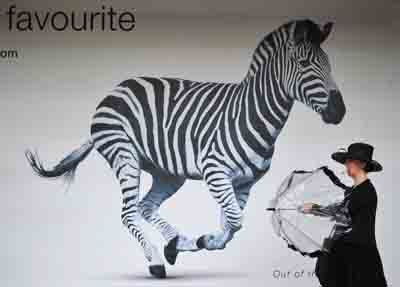 在英國伯克郡,一名準(zhǔn)備前往皇家阿斯科特賽馬會的女士走過一幅畫有斑馬的廣告牌。