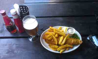 英國倫敦尤斯頓火車站旁一家餐館提供的英國傳統(tǒng)食品Fish and Chips。