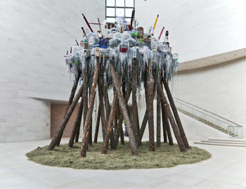 在惠特沃思藝術(shù)館展出的作品中,著名喀麥隆藝術(shù)家帕斯卡爾·馬丁·泰尤專門為本次藝術(shù)展創(chuàng)作的大型室內(nèi)雨林作品《世界分崩離析》,將傳統(tǒng)非洲雕塑和象征物質(zhì)財富的日常雜物有機(jī)組合,模糊了貿(mào)易商品同神圣事物之間的區(qū)別和邊界,體現(xiàn)了作者在世界經(jīng)濟(jì)文化交流的背景下,對非洲社會、傳統(tǒng)文化和生活造成影響的思考與困惑。