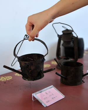 為搜集保存農(nóng)村生產(chǎn)生活工具,廣西恭城瑤族自治縣觀音鄉(xiāng)水濱村2011年建成全縣首個(gè)村級(jí)博物館,展出當(dāng)?shù)剞r(nóng)村生產(chǎn)生活實(shí)物共119件。這些物品絕大部分系村民祖?zhèn)鳎械纳踔潦前倌暌陨系墓哦。博物館自開(kāi)館以來(lái)一直免費(fèi)對(duì)外開(kāi)放,村黨支部的黨員們義務(wù)任管理員,目前已接待近2000名參觀者。 圖為博物館收藏的三角燈。