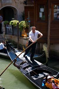 岡朵拉(Gondola),又譯為“貢多拉”或“剛多拉”,是船,而這里最普遍的交通工具就是威尼斯的一種特殊的水上交通工具。岡朵拉是長(zhǎng)約12米、寬約1.7米的黑色平底船,裝飾華美,船的兩頭高翹,使整條船呈現(xiàn)月牙形,鉤嘴形的船頭可以方便地探索橋洞的高度。岡朵拉的船頭呈“S”形,船頭包著鋼皮,船尖上帶有6個(gè)鋼齒的銅飾,那象征著威尼斯總督的帽子和威尼斯市中心的6個(gè)行政區(qū);船另一邊的7條橫杠則代表與圣馬可廣場(chǎng)遙遙相對(duì)、呈月牙形的朱德卡島。