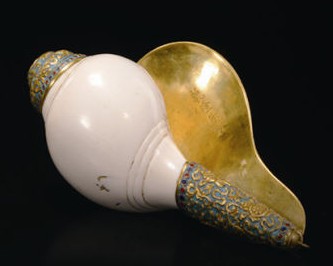 白色海螺法器在遠(yuǎn)古時(shí)期就作為能量、權(quán)威和君權(quán)的象征,它的響聲在古代史詩中能驅(qū)逐惡靈、轉(zhuǎn)移自然災(zāi)害和嚇走毒害人的萬物。法螺亦為法會(huì)時(shí)吹奏的樂器之一,佛經(jīng)上講,釋迦牟尼說法時(shí)聲音洪亮,猶如大螺貝之聲響徹四方,使聞聲者可以驅(qū)魔,滅諸罪障。有清一代統(tǒng)治階層對(duì)于法螺一直有特殊的喜好,女真(滿)族人還在關(guān)外時(shí)期,即使用從蒙古族傳入的法螺,當(dāng)時(shí)為一種軍令工具,以號(hào)令和鼓舞士兵沖鋒,并在心理上給交戰(zhàn)敵方造成威懾。定鼎中原后,海螺主要作為軍隊(duì)操演和皇帝大閱的軍樂器,乾隆二十四年(1759年)修成的《皇朝禮器圖式》中稱海螺為“海蠡”。入關(guān)后清帝對(duì)于海螺的喜愛并未消減,更主要的是與宗教相連。清帝一方面是藏傳佛教忠誠的皈依信徒,另一方面利用宗教信仰來統(tǒng)治和安定國之疆土。