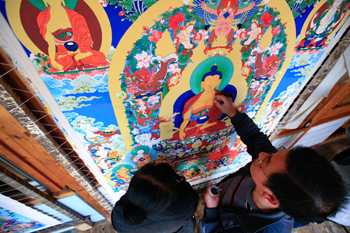 桑斗合有4個(gè)孩子,其中一兒一女跟他學(xué)習(xí)唐卡繪畫(huà)。兒子桑杰卡21歲,學(xué)習(xí)唐卡繪畫(huà)將近5年。他的姐姐多杰卓瑪學(xué)習(xí)唐卡繪畫(huà)10多年,現(xiàn)在已經(jīng)能獨(dú)立完成打磨顏料、素描、填色、后期花邊等各種工序,是藏區(qū)非常少見(jiàn)的女性唐卡畫(huà)師。由于諸多原因,唐卡繪畫(huà)藝術(shù)一直將女性摒棄于門(mén)外。說(shuō)起當(dāng)年教女兒畫(huà)唐卡的經(jīng)歷,桑斗合記憶猶新。由于家里不舍得初中畢業(yè)的卓瑪出去打工,就產(chǎn)生了讓她學(xué)畫(huà)唐卡的念頭。盡管為此專(zhuān)門(mén)請(qǐng)得了一位活佛的許可,但剛開(kāi)始的時(shí)候桑斗合還是遭到了不少同行的“白眼”和非議。經(jīng)過(guò)多年潛心鉆研和苦練,如今,卓瑪?shù)奶瓶妓囈呀?jīng)頗有所成。女性獨(dú)有的細(xì)膩和沉靜使她的作品頗受歡迎,也逐漸獲得了男性同行們的認(rèn)可和尊重。