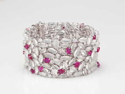 突破以往單一翡翠材質(zhì)的設(shè)計(jì),以頂級(jí)緬甸天然紅寶石納入珠寶設(shè)計(jì)元素,將不同切割的冰種翡翠鑲嵌一起,保有玉質(zhì)清澈剔透之感,綴有以露面立體切割的紅寶石,呈現(xiàn)透白翡翠與露面紅寶交錯(cuò)的獨(dú)特魅力,充滿現(xiàn)代前衛(wèi)的氣息。Rich