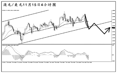 澳元兌美元仍然運行在4小時圖的上升通道之中,短線匯價大幅下落,目前正在考驗通道下沿的支撐1.0360一線。澳元最近的震蕩節(jié)奏明顯,能否跌破此通道成為后市繼續(xù)下行的關鍵。從最近的動能分析,預計澳元小幅刺破通道的希望較大,但由此展開一波單邊下跌并不容易。