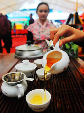 在廣西靈山縣春茶節(jié)上,茶藝師現(xiàn)場(chǎng)泡制六堡茶給顧客品嘗。記者