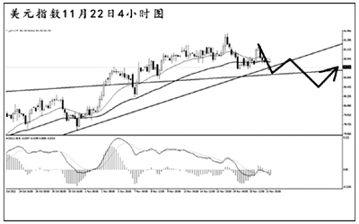 從圖上看,美元指數(shù)在突破日線圖震蕩通道上沿之后的沖高幅度有限,短線發(fā)生了持續(xù)的MACD頂背離信號,多頭動能明顯減弱。目前匯價重新回探通道上沿,關注支撐80.65一線。4小時圖的上升趨勢線正在接受考驗,跌破方可打開進一步的下行空間。短線可繼續(xù)以看美元指數(shù)下調(diào)為主思路。
