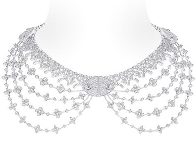 B?umer設(shè)計,再次以品牌尊崇的旅游藝術(shù)為出發(fā)點,將旅程概念超越地域所限,設(shè)計大膽創(chuàng)新,向古老的珠寶工藝及切割技術(shù)致敬之余,并散發(fā)濃厚婉約美態(tài)及時代感,每款設(shè)計都匯聚珠寶工藝精髓,不受時空及風格所限。路易威登兩款專利切割花卉造型鉆石與靈活柔軟精致網(wǎng)狀鏤絲,盡顯品牌珠寶工匠的專業(yè)造詣,黃金物料覆上藍色陶粉又見技術(shù)創(chuàng)新。最能代表品牌歷史及美學神韻的Monogram花卉以不同面貌亮相,變化多端更顯其豐富內(nèi)涵深度。Voyage