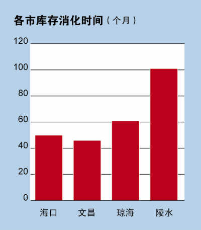 根據(jù)海南克爾瑞的統(tǒng)計數(shù)據(jù),海南樓盤庫存量最低的是三亞市,截至2012年11月底,三亞仍需要2年消化完。而其他重點城市如?跇鞘袔齑嫦芷陂L達50個月,文昌需要46個月,瓊海需要61個月,庫存最高的的陵水則需要101個月。