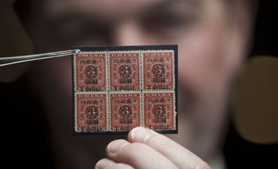 1月8日,郵票專家尼爾·格蘭杰在展示1897年紅印花加蓋3分大字當(dāng)壹圓六方連票,估價(jià)250萬(wàn)至300萬(wàn)港元。
