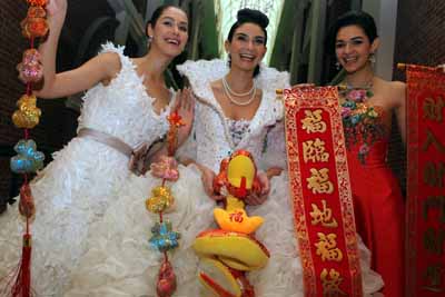 國際某高端婚紗品牌“新年婚紗秀”日前在上海外灘百歲紅樓——外灘22號舉行。圖為模特在展示新年婚紗。