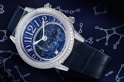 新款腕表無疑是一款完美的天象觀測(cè)儀,為了淋漓盡致地展現(xiàn)天象主題,表盤還設(shè)置了星座日歷,月份指示與星座全年對(duì)應(yīng),通過年歷來調(diào)節(jié)顯示系統(tǒng)以及時(shí)間測(cè)量。該腕表搭載Jaeger-LeCoultre