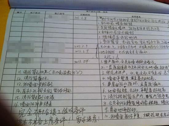事發(fā)當日,柳女士來到綠地商務城售樓處想討個說法,工作人員讓柳女士在留言簿上寫下自己的意見。柳女士現(xiàn)場所拍留言本簿的照片顯示,3月份有三十余位業(yè)主留下了自己的意見。業(yè)主夏先生3月9日的留言達16條之多,主要涉及房屋布局與效果圖差異較大、水電暖等基本設施不到位、房屋施工粗糙等問題。