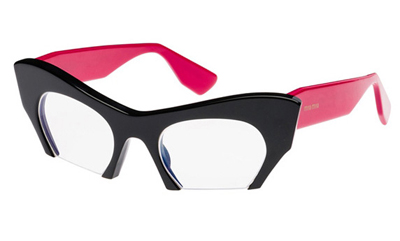 這個概念系列表現(xiàn)在材質(zhì)上,經(jīng)由粗寬線條的鏡架塑成了四種材質(zhì)性:其中一款為2013春夏服裝秀中曝光的傳統(tǒng)塑料材質(zhì),另外兩款為醋酸纖維材質(zhì)以及一款金屬材質(zhì)。這個新眼鏡系列是以中性的黑白色系和ibisco-coloured的鏡架呈現(xiàn),其他也有tartaruga,