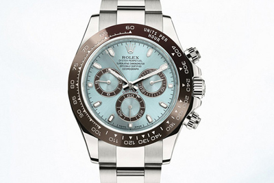 Daytona腕表。此新款腕表配備獨(dú)有的冰藍(lán)色表面和栗啡色Cerachrom陶質(zhì)字圈,使此腕表著名的時(shí)速計(jì)外圈格外矚目。