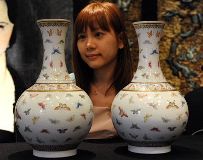 5月20日,工作人員在傳媒預(yù)覽會(huì)上展示清光緒粉彩百蝶紋賞瓶。