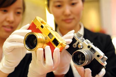 為紀(jì)念萊卡相機(jī)誕生100周年,香港仕宏拍賣有限公司將于6月22日在香港舉行萊卡百年精典收藏相機(jī)拍賣會(huì),屆時(shí)將拍賣198款從世界各地收集來(lái)的萊卡稀有藏品。圖為在北京舉行的新聞發(fā)布會(huì)上,工作人員在介紹即將拍賣的中華人民共和國(guó)建國(guó)60周年紀(jì)念版萊卡相機(jī)和萊卡IIIG/IIIF相機(jī)。