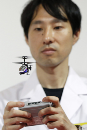 在2013東京國際玩具展上,工作人員展示中國銀輝玩具公司推出的遙控飛機“納米獵鷹”!凹{米獵鷹”長8.11厘米,高5.09厘米,寬2.24厘米,是載入吉尼斯世界紀(jì)錄的最小遠程遙控模型飛機。