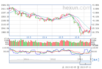 判斷大盤震蕩上行的依據(jù)并不是在于政策面出現(xiàn)了一些趨好的跡象,主要是基于大盤的技術(shù)走勢。例如在6月25號,大盤在跌破解放底之后,突然加速下跌,下探1849點,如此瘋狂的空頭觸動了監(jiān)管層的政策紅線,立即有大資金把大盤硬硬地托回到1949點之上的1959點,這十分明顯地向市場表明1949點就是政策底,所以大盤在該點位震蕩可以,打滾可以,橫行可以,但不能再次下行,這就是判斷近期大盤的主要參照點。