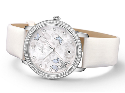 36.8mm表殼襯有帶珍珠貝殼效果的白色條紋緞面皮革表帶,并配以18K白金表扣。直紋磨砂底蓋則鐫刻碟飛及歐米茄標(biāo)志。碟飛Prestige腕表選用2500同軸機(jī)芯。這款1999年面世的自動(dòng)機(jī)芯配置同軸擒縱系統(tǒng),并為機(jī)械腕表制造技術(shù)帶來革命性突破。