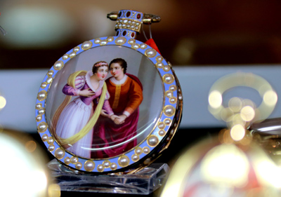 這是在日內(nèi)瓦佳士得秋季拍賣香港預(yù)展上展出的一塊1820年制作的18K金琺瑯鑲珍珠懷表,估價(jià)為9.5-15萬(wàn)美元。
