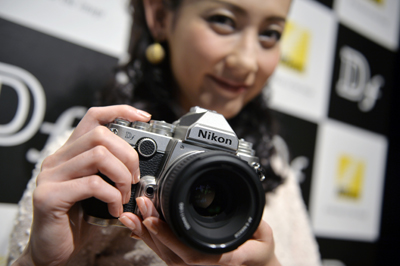 11月5日,在日本東京舉行的一場媒體活動中,模特與尼康公司新款全畫幅數(shù)碼單反相機(jī)“尼康Df”合影。這款機(jī)型延續(xù)了經(jīng)典的手動對焦單反相機(jī)外觀,幾乎可以搭配所有尼康F卡口鏡頭。
