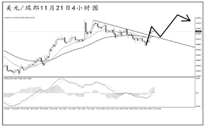 美元兌瑞郎在下降趨勢線的壓制作用下一路走低,短線的下跌力度有所加大,但跌幅很快便被強勁的上沖走勢所收復(fù)。4小時圖上看,道氏低點支撐0.9090被小幅跌破,但下跌勢頭未能延續(xù)。短線的上沖將均線系統(tǒng)和下降趨勢線的阻力雙雙升破,預(yù)計匯價將繼續(xù)上行挑戰(zhàn)0.9250的高點阻力。