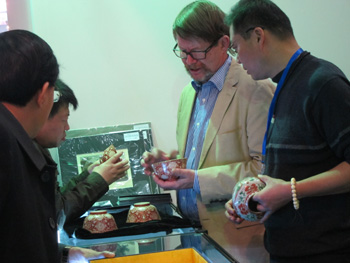 11月15日,在中國文物國際博覽會上瑞典古董商人向收藏者展示中國明清瓷器。記者