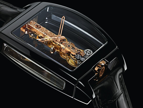 長(zhǎng)形機(jī)芯置于黑色陶瓷表殼內(nèi),表面、表背及兩側(cè)由藍(lán)寶石水晶玻璃制成,360度透視出直線式 機(jī)芯結(jié)構(gòu),讓人陶醉于迷人的透明藝術(shù)之中。設(shè)于上層的夾板橋由5N18K