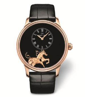 2014年,中國迎來馬年,馬不僅是活力與勇氣的象征,更是今年雅克德羅(Jaquet Droz)生肖腕表的主角。該品牌推出的三款專屬腕表皆由雅克德羅的手工藝大師采用獨一無二的精湛工藝打造而成。鐫刻、微繪……每一匹駿馬的肌理、馬鬃都刻畫得非常細(xì)致,惟妙惟肖。表盤上的駿馬矯健俊逸,姿態(tài)瀟灑,仿佛脫離了韁繩的束縛,在遼闊的原野上掣風(fēng)而馳。