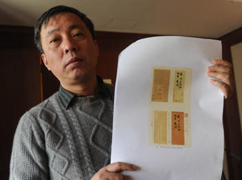 收藏家劉益謙手持蘇軾《功甫帖》的照片復(fù)印件介紹相關(guān)情況。記者