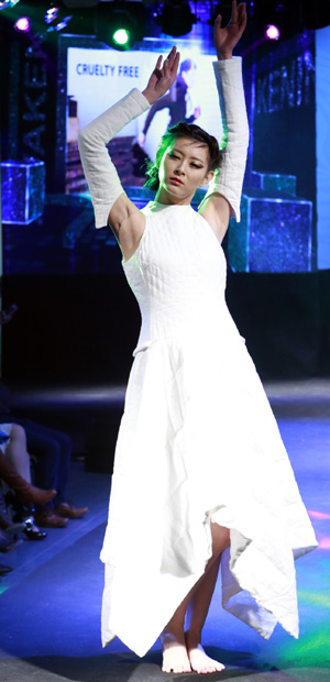 由全球善待動(dòng)物組織亞太分部主辦的“無(wú)傷害時(shí)裝秀”近日在北京國(guó)藝美術(shù)館舉行。本次秀場(chǎng)展示的系列時(shí)裝遵循“零皮草 無(wú)傷害”設(shè)計(jì)理念,面料均采用植物纖維制成,以傳達(dá)“保護(hù)生靈、尊重生命、善待動(dòng)物”的觀念。圖為模特在展示美國(guó)設(shè)計(jì)師希爾加特設(shè)計(jì)的時(shí)裝。