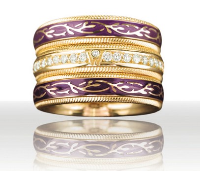 華洛芙幻想系列指環(huán),采用華洛芙獨(dú)創(chuàng)的冷琺瑯技術(shù),將德國珠寶對于精湛工藝的追求完美體現(xiàn),極其細(xì)膩的手工打磨和多層的浮雕工藝讓最挑剔的珠寶收藏家都會為之感嘆。每枚指環(huán)在給與佩戴者絲滑的旋轉(zhuǎn)快感的同時(shí),還賦予視覺上獨(dú)特的透明感,堅(jiān)固的耐磨性,足以見證和傳承幾代人堅(jiān)貞不渝的愛情故事。而豐富的色彩選擇也賦予了佩戴者根據(jù)不同場合、不同著裝、不同心情,隨意組合搭配的個(gè)性表達(dá)。紫色代表神秘女神;而鉆石代表著莎士比亞筆下的朱麗葉對愛情的堅(jiān)貞;綠色孕育生命的無限生機(jī);紅色代表喜慶和歡快,猶如陽光下歡舞的熱烈奔放;緋色與白色的香甜奶油氣息,芬芳在戀人的甜蜜舞步中。浪漫的二人世界里,愛情是旋轉(zhuǎn)的、美妙的和堅(jiān)定的,猶如一段圓舞曲,緊緊相擁,在旋轉(zhuǎn)中將愛意傳達(dá)。