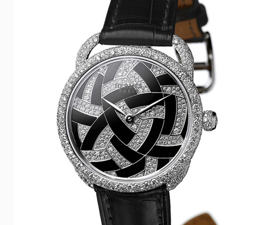 這些祖?zhèn)鞯氖智蚬に,啟發(fā)愛馬仕絲巾的創(chuàng)作靈感,其中一款圖案現(xiàn)被Arceau腕表重新演繹。腕表以18K白金制作,限量發(fā)行,鉆石根據(jù)雪花鑲嵌方式密鑲,表盤將鉆石結(jié)合黑瑪瑙、白色珍珠母貝、青金石或蛋白,以細(xì)工鑲嵌工鑲重現(xiàn)其中一款手球圖案。