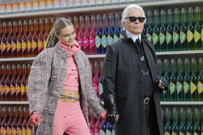在巴黎時(shí)裝周應(yīng)接不暇的各大品牌發(fā)布會(huì)中,香奈兒的秀場(chǎng)總是別出心裁獨(dú)樹(shù)一幟。今年,著名設(shè)計(jì)師卡爾·拉格費(fèi)爾德將位于巴黎大展覽館(又名大皇宮)的秀場(chǎng)變身為一個(gè)“大超市”,模特們身著新款成衣穿行其中,別有一番趣味。圖為卡爾·拉格費(fèi)爾德(右)與模特卡拉·德萊文涅在時(shí)裝秀結(jié)束時(shí)向觀眾致意。