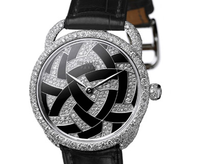 Arceau腕表系列重新演繹。腕表以白金制造,限量發(fā)行,鉆石根據(jù)雪花鑲嵌方式密鑲,表盤將鉆石結(jié)合白色珍珠貝母、瑪瑙、青金石或蛋白石,以細(xì)工鑲嵌工藝重現(xiàn)其中一款毛球圖案。