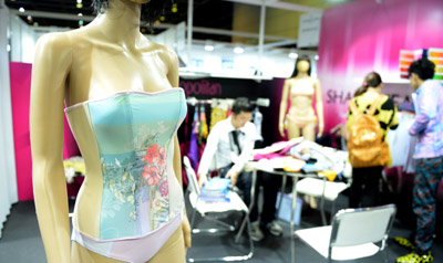 香港國際內(nèi)衣泳裝展1日在香港會展中心舉行,展覽主題為“身體、心靈和精神的調(diào)和”。圖為參展商展示的塑身內(nèi)衣。