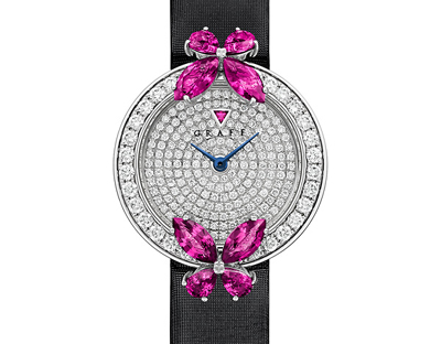 這枚26毫米女裝腕表有兩個獨特的款式可供選擇,一款在12時和6時位置也鑲有鉆石蝴蝶,另一款則在6時位置鑲有蝴蝶。這一枚優(yōu)雅的腕表配以黑色緞面表帶,限量300枚。