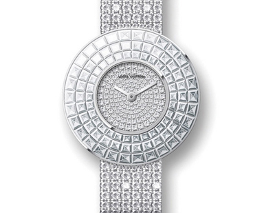 Absolu Riviere腕表則把珠寶工藝進一步極致發(fā)揮,不僅僅是面盤,連指針以及表鏈都鋪上了明亮切割的鉆石。