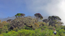 進(jìn)園后按路標(biāo)有9.4公里的徒步環(huán)形道。一路上隨處可見熱帶植物和蕨類植物,有深褐色的,有銀色的。路則越來越難走,有時(shí)在草叢中走,有時(shí)在狹窄的小道上走,有時(shí)要攀登超過三十公分的高臺(tái)階,以至于大家不得不互相攙扶。