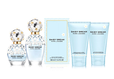 Dream」夢幻小雛菊香水,圓弧球狀的瓶身,穿戴上了猶如白日夢般夢幻清爽的淡藍色,上方裝飾著滿滿的系列小雛菊花朵圖樣;以花果香為主軸的味道,由黑莓、柚子、荔枝和紫藤領出明亮、充滿女人嫵媚的前調,再選用椰子、麝香及白木材為這自由的香氣劃下后調句點。