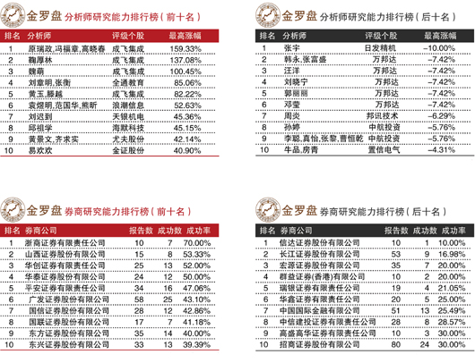 雖然6月市場上強勢股明顯增多,但是大盤總體表現(xiàn)欠佳,從金羅盤數(shù)據(jù)可見,分析師薦股成績差距較大,僅有五組分析師所薦股票在20日短線評測中錄得超過80%的漲幅,大部分分析師的薦股成績都集中30%至40%之間。伴隨創(chuàng)業(yè)板近期的反彈,券商分析師們在創(chuàng)業(yè)板股票推薦方面均有不俗表現(xiàn),三只創(chuàng)業(yè)板股票全通教育、天銀機電和海默科技的漲幅均幫助分析師進入榜單前十。