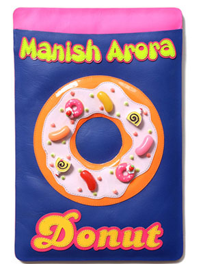 Olympia洋溢80年代氣息的透明粉紅色Fetish粗跟涼鞋,加上Manish Arora 的糖霜甜甜圈iPad