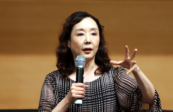 著名作家嚴(yán)歌苓在香港書展“名作家講座系列”上演講。記者 李鵬/攝 |