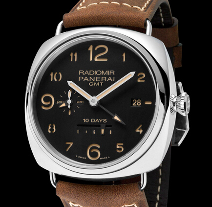 枚。此款腕表外型優(yōu)雅的枕型表殼以拋光精鋼制成;簡約的黑色三明治表盤上以夜光阿拉伯?dāng)?shù)字標(biāo)示小時,并設(shè)有日期顯示、10日線性動力儲存顯示,九點鐘方位設(shè)有小秒盤,同時設(shè)有晝夜顯示指針;表盤中央除時針和分針,還有旅游人士必備第二時區(qū)指針。表盤上的所有元素,均涂有淡褐色Super-LumiNova.。腕表采用復(fù)古真皮表帶,搭載沛納海位于瑞士諾沙泰爾(Neuchatel)表廠自行研發(fā)的自動上鏈機(jī)芯P.2003。