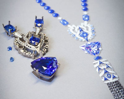 白金長(zhǎng)項(xiàng)鏈,鑲嵌有公主方形切割與明亮式切割鉆石,凸圓形切割藍(lán)寶石,圓形藍(lán)寶石,珠子和青金石圖案,黑色尖晶石珠,三顆枕形切割藍(lán)寶石,一顆來(lái)自斯里蘭卡,重達(dá)4.26克拉,兩顆來(lái)自馬達(dá)加斯加,分別重4.70克拉和5.13克拉,一顆45.64克拉的三角枕型切割坦桑石。項(xiàng)鏈的每條穗子頂端也都鑲嵌有閃耀的鉆石,真正360度無(wú)死角的設(shè)計(jì)理念。