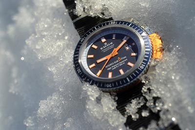 Sub令人驚艷的500米防水來(lái)自于在表冠上創(chuàng)新的加入鎖緊防水圈及避震防水圈;而能成為陪伴Redl冰下潛水的重要關(guān)鍵是裝置獨(dú)特可滑動(dòng)的表冠保護(hù)蓋確保腕表在極度寒冷的環(huán)境下仍能順利運(yùn)作。這只Hydro