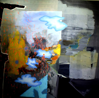 迪?歐利維本次參展的大幅抽象作品《自然景》,大面積灰色調(diào)的塊面穿插中,似云似霧的深處,崩裂出血色的光點(diǎn),宛如宇宙爆炸、黑洞拋灑,吸引了許多觀眾。