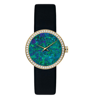 DIOR(迪奧)高級珠寶藝術總監(jiān)Victoire de Castellane 最鐘愛的寶石蛋白石,它能綻放出各式各樣奇特的迷人色彩!拔易钕矏鄣膶毷堑鞍资。因為它火數十足,宛如活著一樣。就如莫內的《睡蓮》,當中糅合各種色彩,彷佛有一只精靈活在其中!薄猇ictoire de Castellane。La D de Dior以蛋白石作為25mm表盤,將DIOR的制表工藝與珠寶專業(yè)完美結合,孕育出獨特非凡的腕表作品。全球限量一枚。